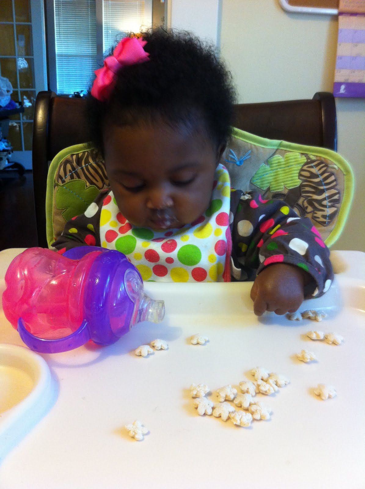 She tried puffs for the first time. The sippy cup is almost mastered, but the puffs don't make it to the mouth yet. Just a note, its not a good idea to let the water leak all over the tray and the puffs sit in it...you'll have a mess.